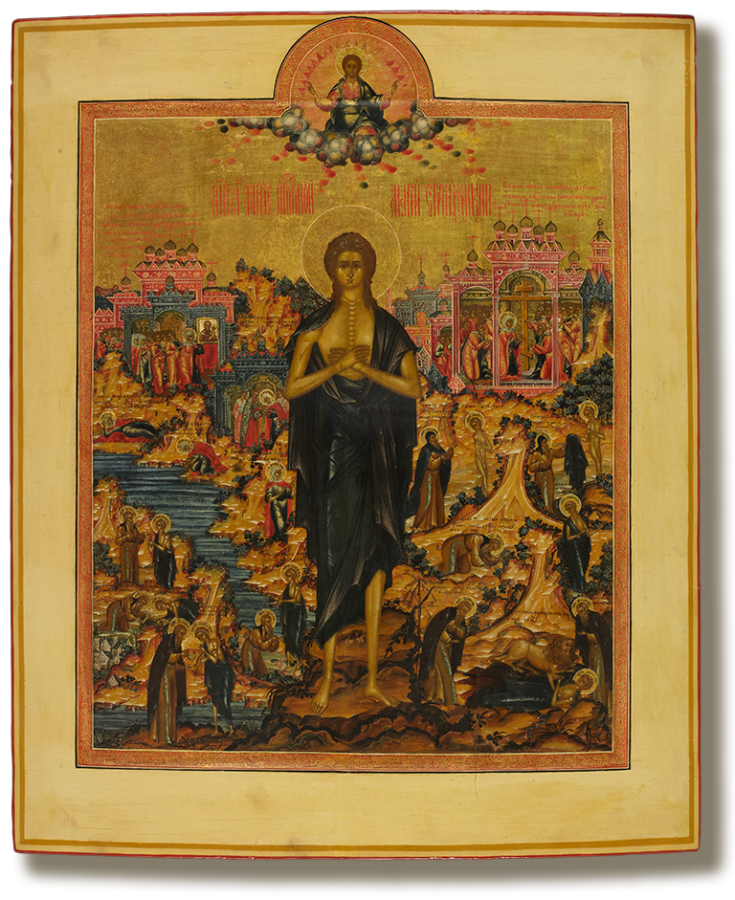 Выдающимся памятником палехского искусства последних десятилетий – конца XVIII века является один из шедевров собрания Музея русской иконы – образ Святой Марии Египетской, со сценами жития. Его редчайшая иконография явно связана с особым заказным характером памятника. Благородный и сдержанный зеленовато-коричневый колорит иконы с высоким доминирующим в композиции пейзажем, испещренным причудливыми горками, среди которых свободно распределены изящные фигуры святых, заставляют вспомнить лучшие памятники середины XVIII века – рамы с клеймами Акафиста Спасителю, Богоматери и Николаю Чудотворцу из Крестовоздвиженской церкви в Палехе (Государственный музей палехского искусства). Изощренная миниатюрная живопись напоминает о божественной красоте тварного мира, на фоне которого выделена истонченная, исполненная великого достоинства аскетическая фигура Марии Египетской, великой грешницы, получившей прощение и благодать Божию в силу своих духовных подвигов. Выразительность грациозного образа и драгоценность живописной поверхности еще более подчеркивает характерная для палешан богатая киноварная с золотым орнаментом рамка.