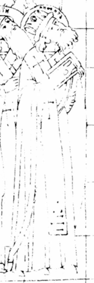 Собор Новгородских святых (фрагмент). Рисунок (прорись с иконы /изображение, кроме подписей святых в нимбах, зеркальное). Россия. XVIII века. Постников, 1899, таб. LXIX. Ретушировано.