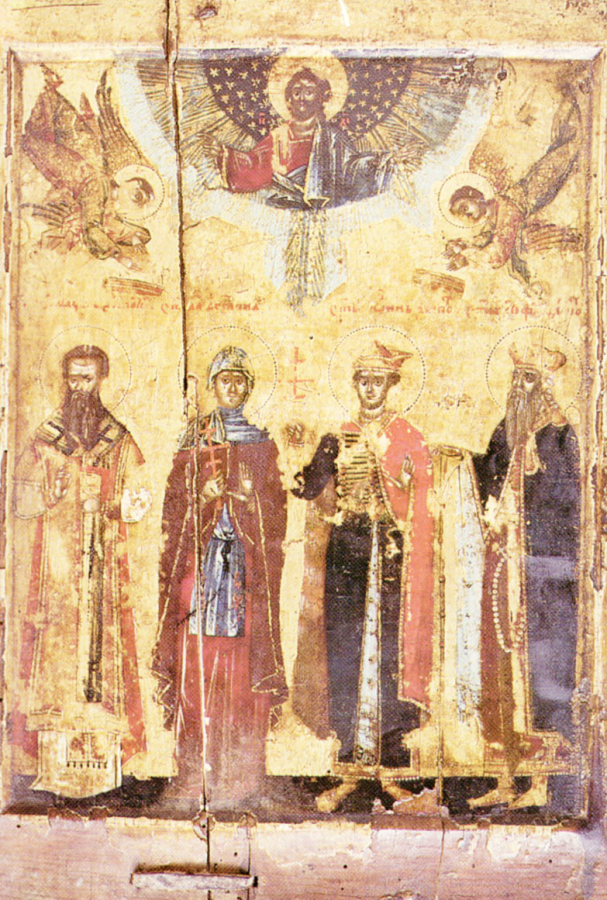 Свв. Савва I архиепископ, преподобная Ангелина деспотисса Сербская, её сын святой Иоанн (Бранкович) и святой Стефан деспот. Икона. Сербия. XVI в. Ризница монастыря Керка в Далмации (Сербская Православная Церковь).