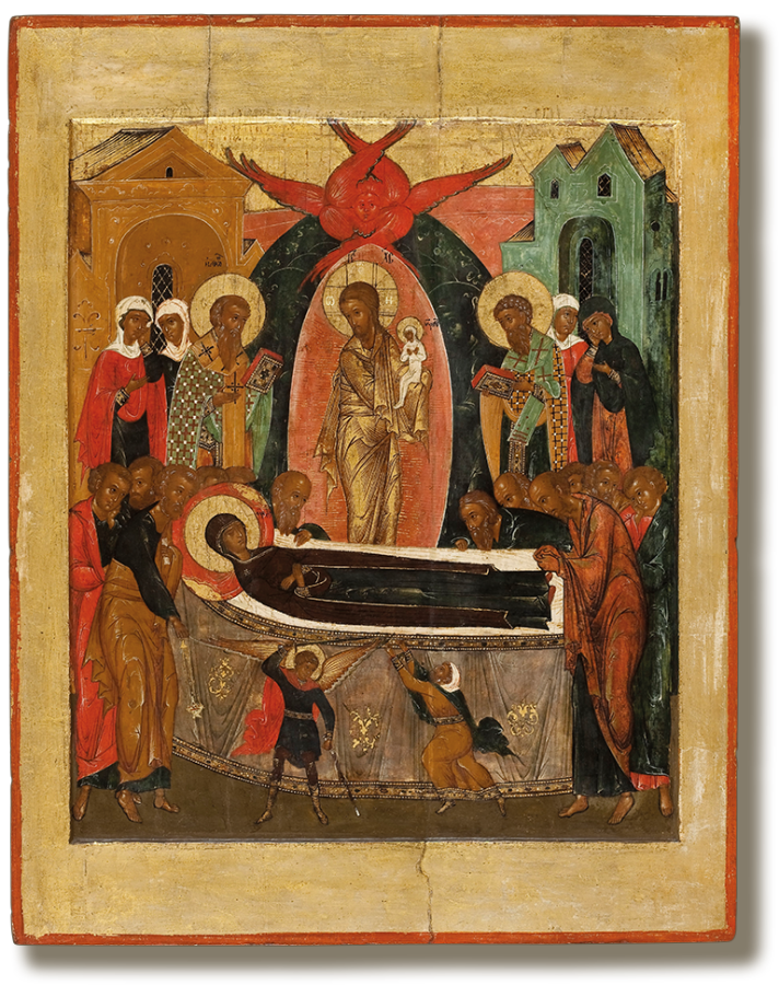 Эта икона посвящена Успению Пресвятой Богородицы.