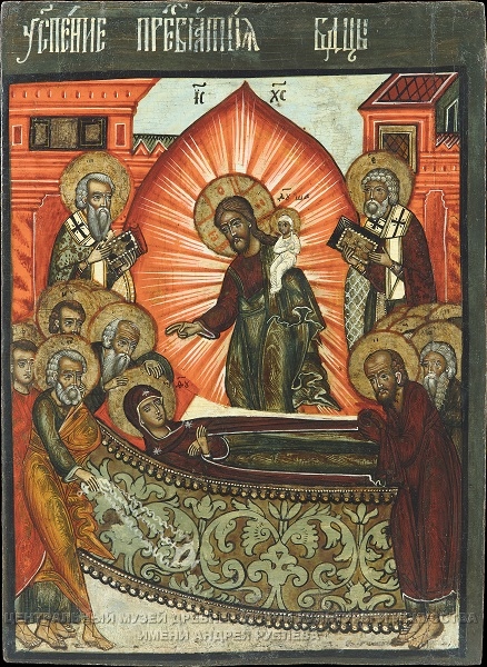Эта икона посвящена Успению Пресвятой Богородицы.