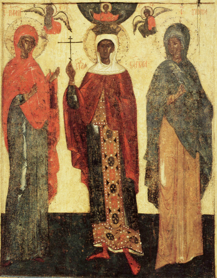 Свв. Варвара, Параскева, Иулиания. Икона. Псков. Последняя четверть XIV в. ГТГ. Москва.