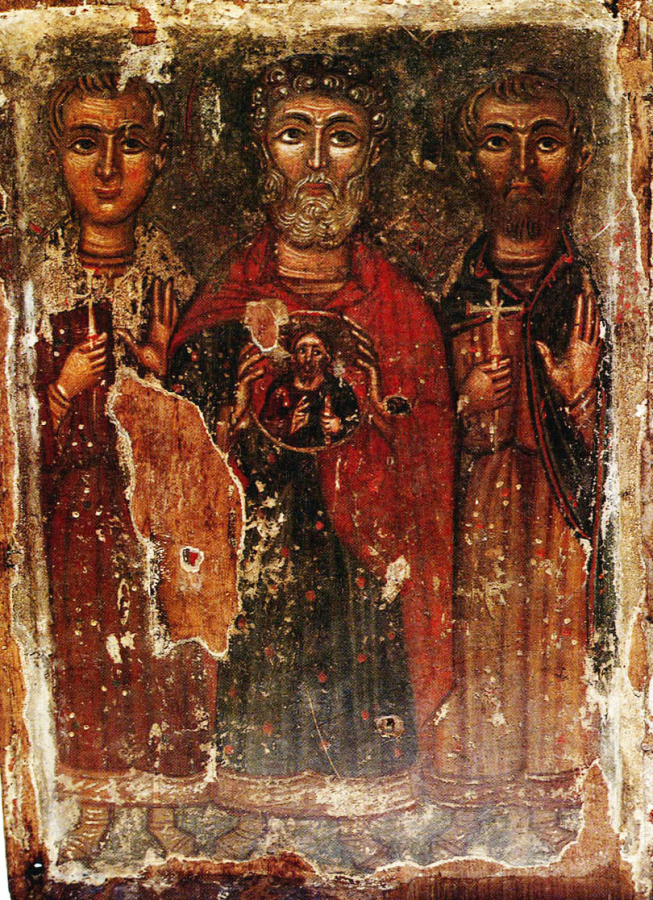Мчч. Мина, Виктор и Викентий. Икона. Кипр. X в. 31,9 х 22,4. На иконе изображены мчч. празднуемые в один день. Из Ларнаки. Кипр.