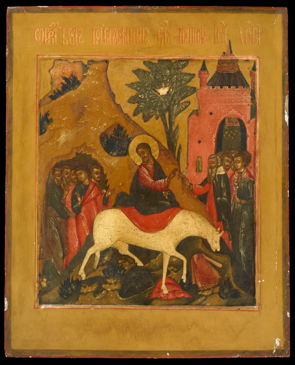 Эта икона посвящена Входу Господню в Иерусалим.