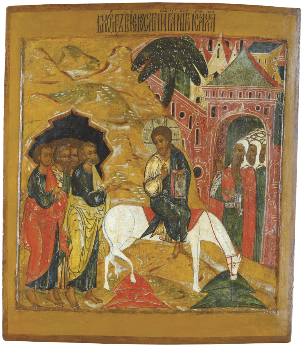 Эта икона посвящена Входу Господню в Иерусалим.