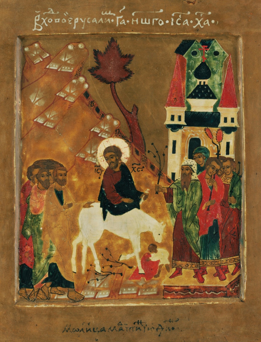 Эта икона посвящена Входу Господню в Иерусалим.