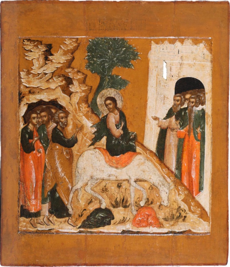 Эта икона посвящена Входу Господню в Иерусалим.