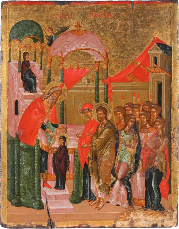 Эта икона посвящена Введению во храм Пресвятой Богородицы.