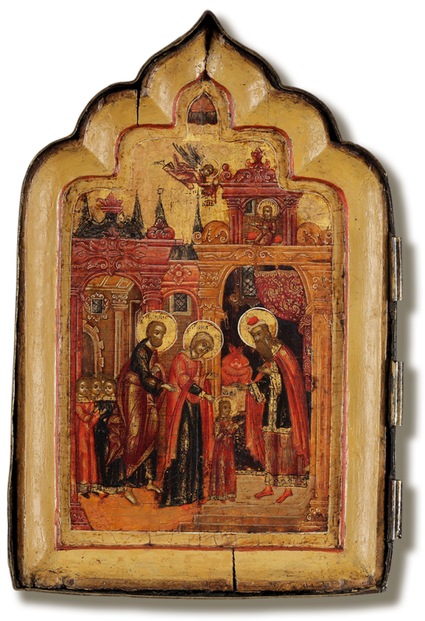 Композиция сцены, иллюстрирующей один из ключевых моментов протоевангельского цикла – введение трехлетней Марии в Иерусалимский храм и посвящение Ее Господу, – восходит к одному из ранних вариантов богородичного праздника. Такая симметричная схема, в которой главные действующие лица помещаются в центре, первосвященник Захария встречает юную Богородицу у врат Иерусалимского храма, а девы со светильниками шествуют за родителями Марии, почти без изменений сохраняется на Руси вплоть до позднего Средневековья. Однако существенно переработаны архитектурные кулисы, на фоне которых разворачивается действие, и дополнена отдельными деталями. Иконография восходит к праздничной сцене, сложившейся в искусстве московских мастеров Оружейной палаты в третьей четверти XVII в., творчески осмысленной в иконописи Ярославля последней трети столетия. Отличительная особенность композиции – введение интерьера святая святых Иерусалимского храма (восходящего к подробностям гравюры с изображением Сретения Христа из Библии Пискатора 1650 г.): за фигурой первосвященника Захарии видны приоткрытый поднятой завесой престол и священные предметы на нем. Однако в сравнении с московскими памятниками, например с праздничной иконой 1679 г. из иконостаса собора Вознесенского монастыря Московского Кремля, подробности эти заметно сокращены, а рисунок их упрощен. От западного оригинала здесь сохраняется изображение отодвинутого тяжелого балдахина, приоткрывающего вход в святая святых, и херувима, охраняющего Ковчег Завета. Но проиллюстрированный гравюрой библейский образ «сидящих на золотой крышке двух золотых херувимов» был заменен мастером на традиционный для иконописи огненный облик. Композиция публикуемого памятника довольно близко повторяет композицию клейма с изображением Введения Богородицы во храм на иконе «Богоматерь Кипрская в чудесах» из церкви Иоанна Златоуста в Ярославле (ЯХМ), написанной Семеном Спиридоновым Холмогорцем в 1680 г. Как и там, действие на створке, действительно уподобленной вытянутому иконному клейму, с характерными для этого мастера пропорциями, представлено в интерьере пышных барочных палат со шпилями, профилированными антаблементами, которые поддерживаются каннелированными колоннами с капителями, украшенными резными картушами и лепниной. От архитектурных реалий нарышкинского барокко сохраняются резные рамы окон с коваными решетками. Как и в иконе Холмогорца, сцена кормления Марии ангелом в святая святых размещена в закомаре – отдельном архитектурном компартименте храма.
