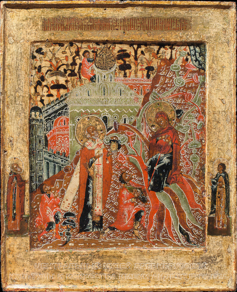 Икона Явление Богоматери и святителя Николая Чудотворца пономарю Юрышу, с избранными святыми на полях. Вторая половина XVII века. Вологодские земли (?)