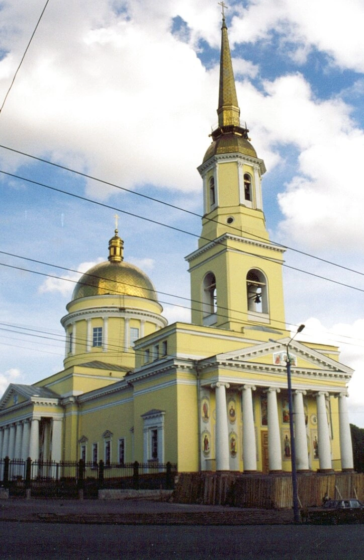 Собор, возведённый в лучших традициях русского классицизма, поражает своим гармоничным обликом и благородным величием. На снимке прекрасно видны его строгие и монументальные формы: мощный световой барабан, увенчанный золочёным куполом и крестом, высокая многоярусная колокольня, устремлённая в небеса, и торжественный портик с белоснежными колоннами. Фасад храма, выкрашенный в тёплые охристые тона, декорирован белыми пилястрами, карнизами и лепными элементами, что создаёт ощущение праздничности и лёгкости.