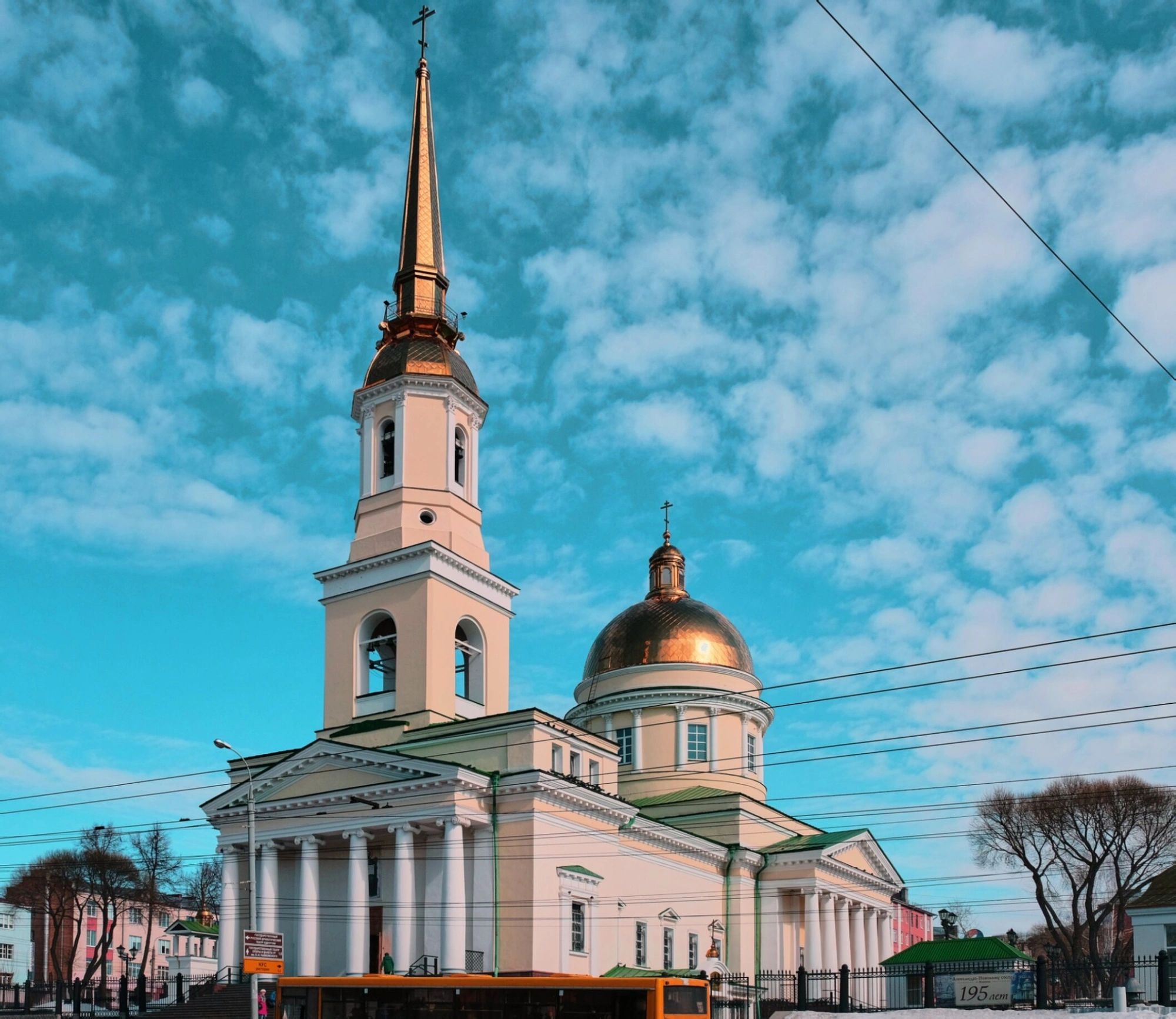 На фотографии запечатлён величественный Александро-Невский кафедральный собор, являющийся одним из духовных центров Ижевска и всей Удмуртской митрополии. Святыня располагается в самом сердце города, на улице Максима Горького, и является архитектурной доминантой, хорошо узнаваемой благодаря своему золотому пятиглавию и высокой колокольне, увенчанной золочёным шпилем.