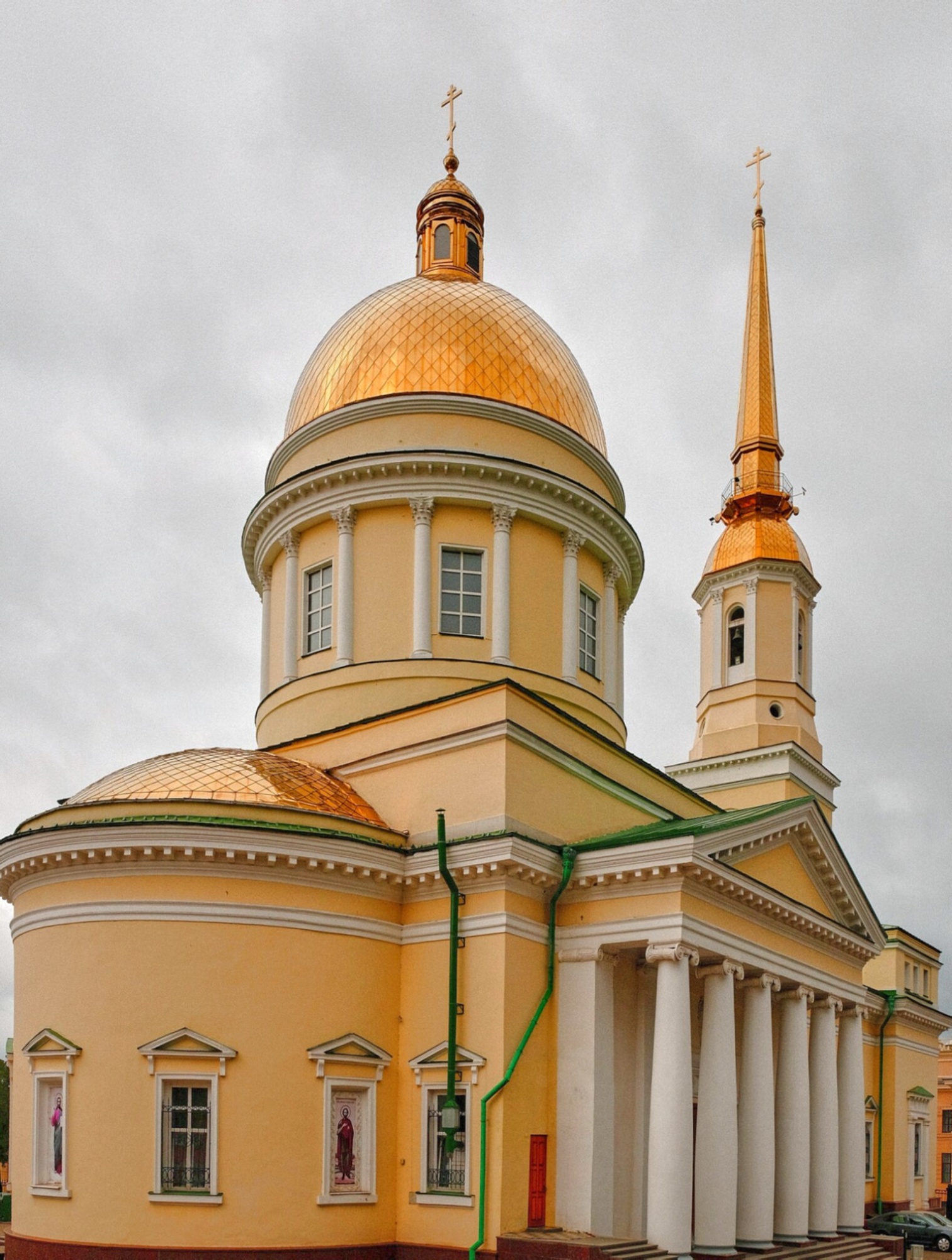 На фотографии запечатлён величественный Александро-Невский кафедральный собор, являющийся одной из главных духовных и архитектурных достопримечательностей столицы Удмуртской Республики — города Ижевска. Этот православный храм, освящённый в честь святого благоверного князя Александра Невского, представляет собой выдающийся образец русского классицизма и играет ключевую роль в формировании исторического облика города.