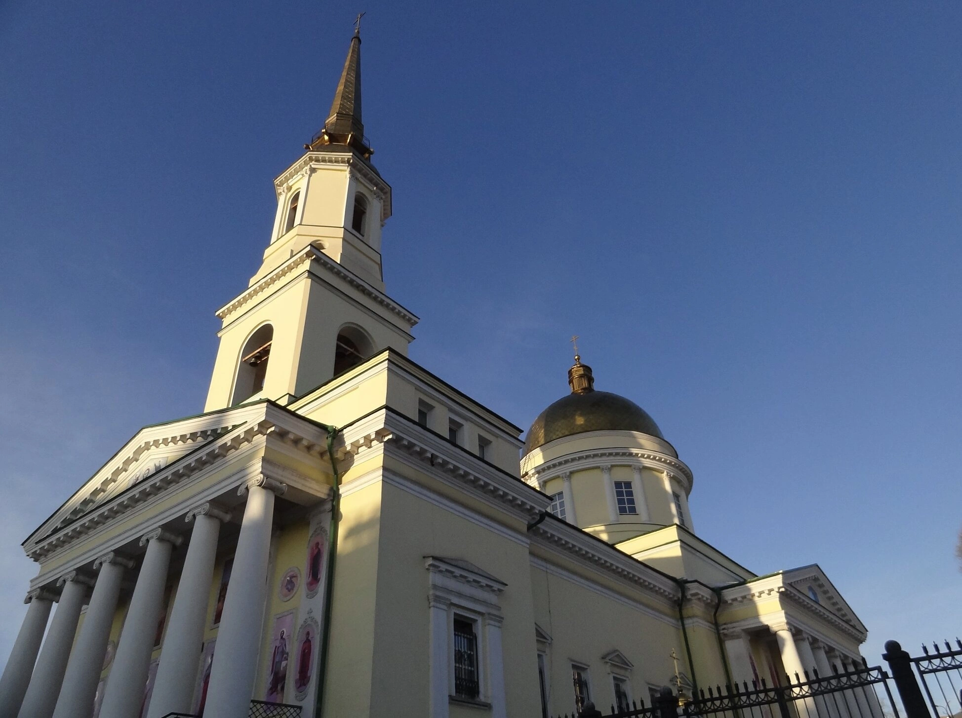 На фотографии запечатлён величественный Александро-Невский кафедральный собор, являющийся одной из главных православных святынь столицы Удмуртской Республики — города Ижевска. Снимок передаёт благолепие этого архитектурного сооружения, выполненного в стиле высокого классицизма.