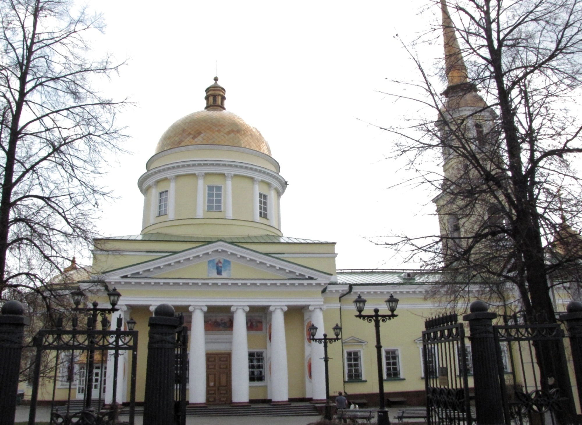 На переднем плане фотографии видна ажурная кованая ограда с традиционными уличными фонарями, подчёркивающая значимость и неприкосновенность священного пространства. Оголённые ветви деревьев, окружающих собор, указывают на позднюю осень или зимний период, что добавляет снимку особое настроение умиротворения и сосредоточенной молитвы.