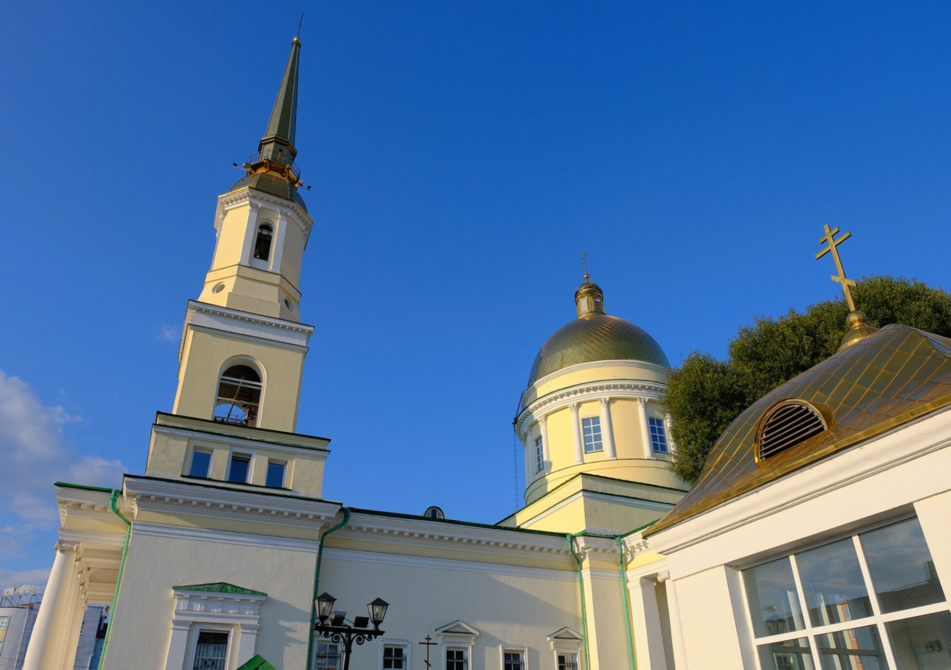На представленной фотографии запечатлён величественный Александро-Невский кафедральный собор, являющийся одной из главных православных святынь Ижевска и всей Удмуртской митрополии. Снимок позволяет оценить монументальность и благолепие архитектурного облика этого выдающегося храма.
