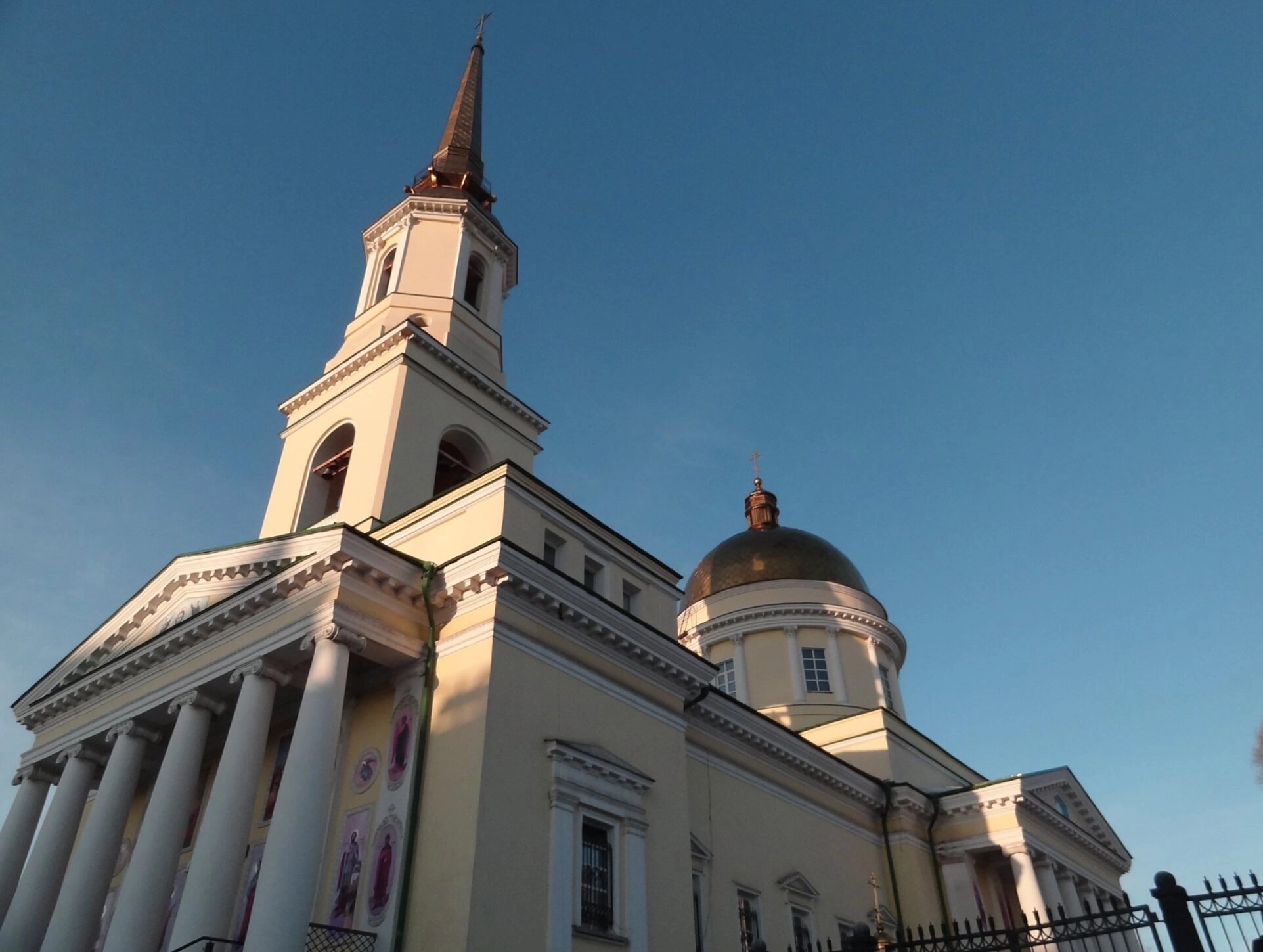 Собор, освящённый в честь святого благоверного князя Александра Невского, представляет собой выдающийся образец русского классицизма первой половины XIX века. Монументальное здание, квадратное в плане, увенчано мощным сферическим куполом на высоком барабане, который завершается золочёной главой с крестом. Строгий и лаконичный фасад украшен величественной колоннадой, что характерно для архитектуры эпохи высокого классицизма. Высокий шпиль колокольни устремляется в небо, символизируя духовное устремление верующих.