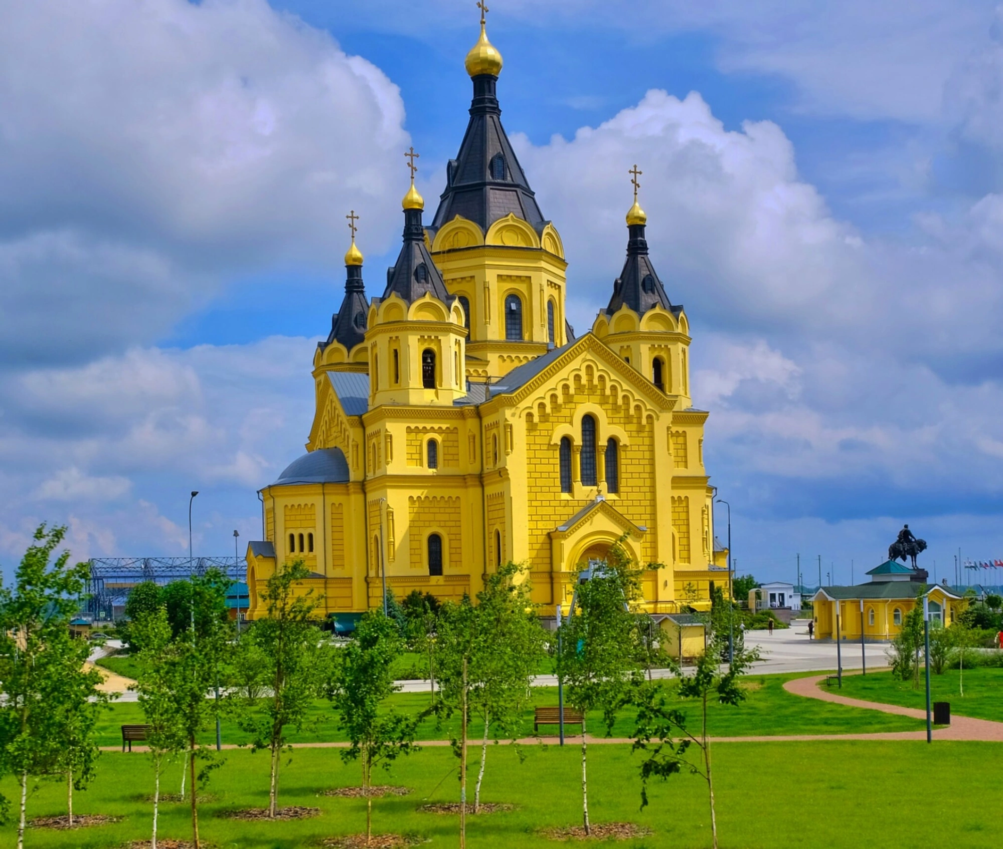 На представленной фотографии запечатлён кафедральный собор во имя святого благоверного князя Александра Невского в Нижнем Новгороде. Храм возведён в 1868–1881 годах по проекту архитектора Льва Даля и является выдающимся образцом русской культовой архитектуры второй половины XIX века.