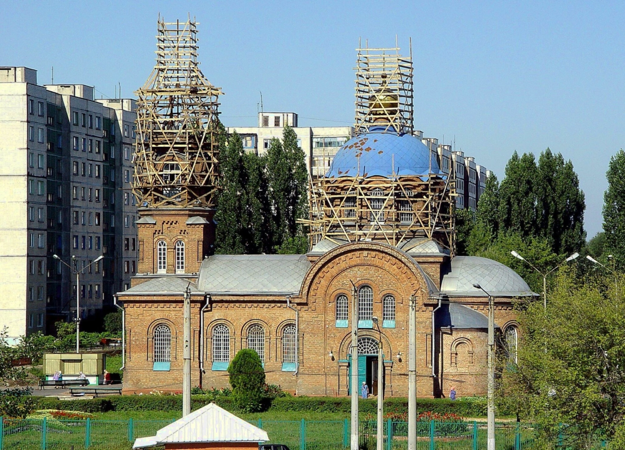 На представленной фотографии запечатлен Свято-Александро-Невский кафедральный собор города Старый Оскол в период проведения реставрационных работ. Храм, освященный в честь святого благоверного князя Александра Невского, является значимым духовным центром Белгородской митрополии.