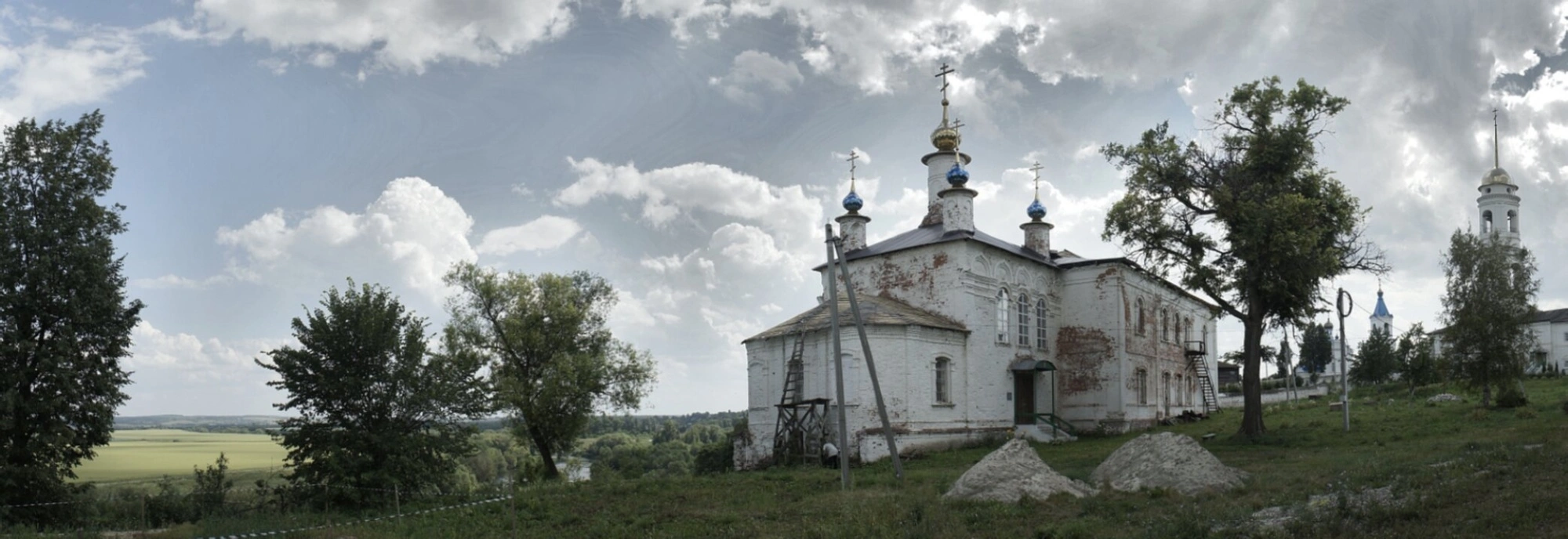 Величественный вид храма на фоне облачного неба и окружающей природы подчёркивает духовную значимость этого святого места, которое на протяжении нескольких столетий является одним из центров православного благочестия в Тульском крае.