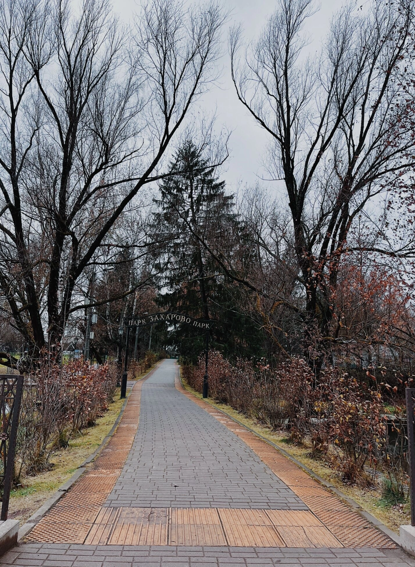На представленном снимке запечатлена осенняя аллея в парковой зоне усадьбы Захарово, что в окрестностях Кубинки. В центральной части композиции находится мощёная дорожка, устремляющаяся вглубь парка. По обеим сторонам аллеи расположены деревья, уже сбросившие листву, что свидетельствует о позднеосеннем или раннезимнем периоде.