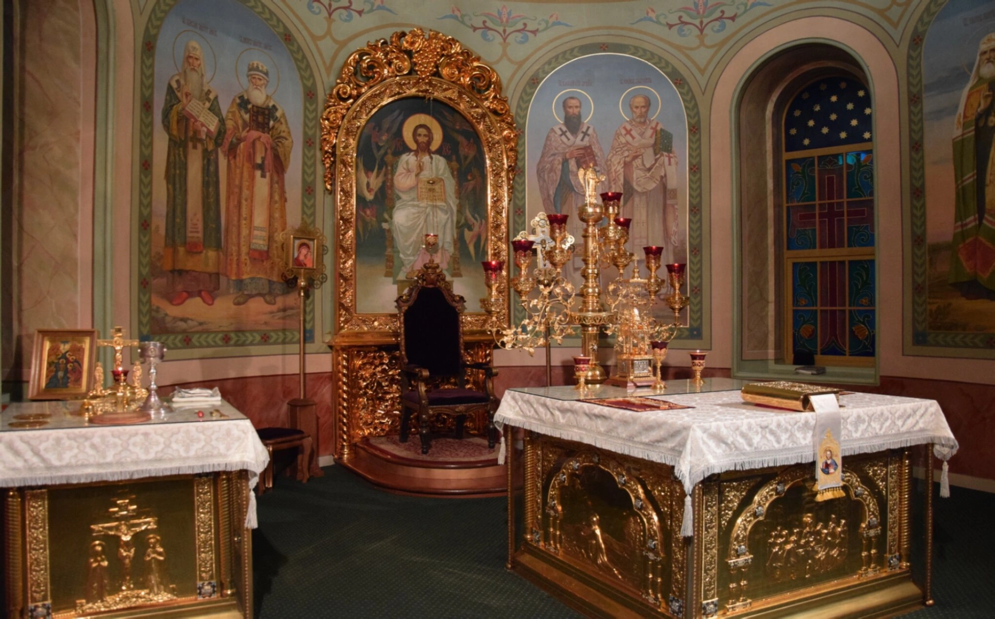 Перед иконостасом установлен украшенный плащаницей престол, на котором совершается таинство Евхаристии. По обе стороны от него расположены жертвенник и горнее место. Вся алтарная зона обильно украшена позолоченными элементами декора, что создаёт ощущение неземного света и торжественности. На переднем плане видны стационарные подсвечники, предназначенные для возжжения свечей верующими, а также церковная утварь, используемая во время богослужений.