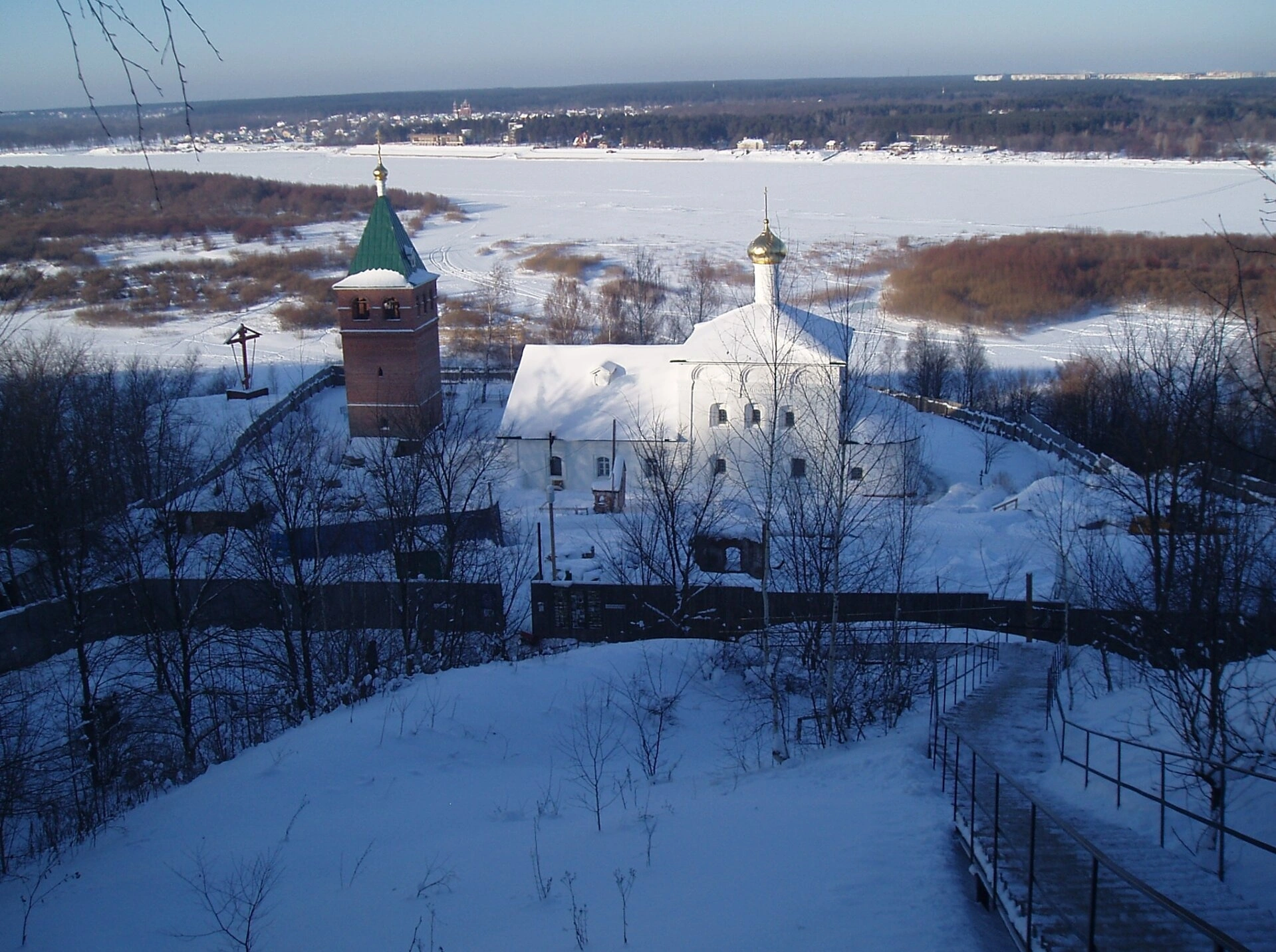 На заднем плане открывается вид на величественную реку Оку, скованную льдом и покрытую снежным покровом. За рекой простираются заснеженные леса и просторы Нижегородского края, создающие ощущение необъятности русской земли и ее духовных богатств.