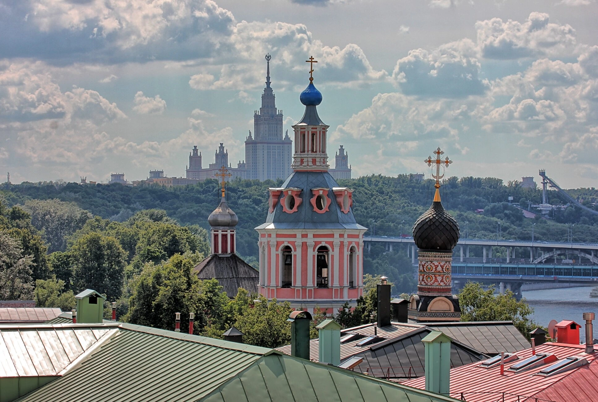 За древними стенами монастыря, хранящими память о нескольких веках русской истории, открывается величественная панорама столицы. Доминантой городского ландшафта является знаменитое здание Московского государственного университета имени М. В. Ломоносова, гордо возвышающееся на Воробьёвых горах. Внизу тихо несёт свои воды Москва-река, пересекаемая ажурным силуэтом Андреевского моста. Зелёные массивы, окружающие монастырь и берега реки, придают пейзажу умиротворённость и естественную красоту.