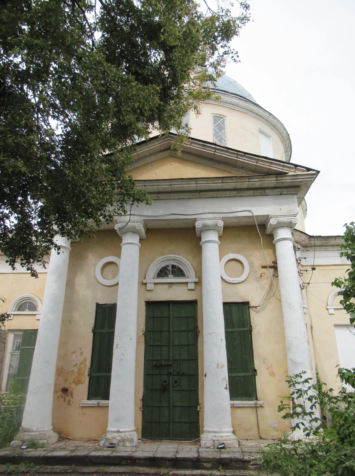 На представленной фотографии запечатлён один из исторических объектов, входящих в комплекс Трёхсвятительской церкви, расположенной в посёлке Белоомут Луховицкого района Московской области. Здание, выполненное в традициях классицизма, является образцом церковной архитектуры XIX столетия и представляет значительную культурную и историческую ценность.