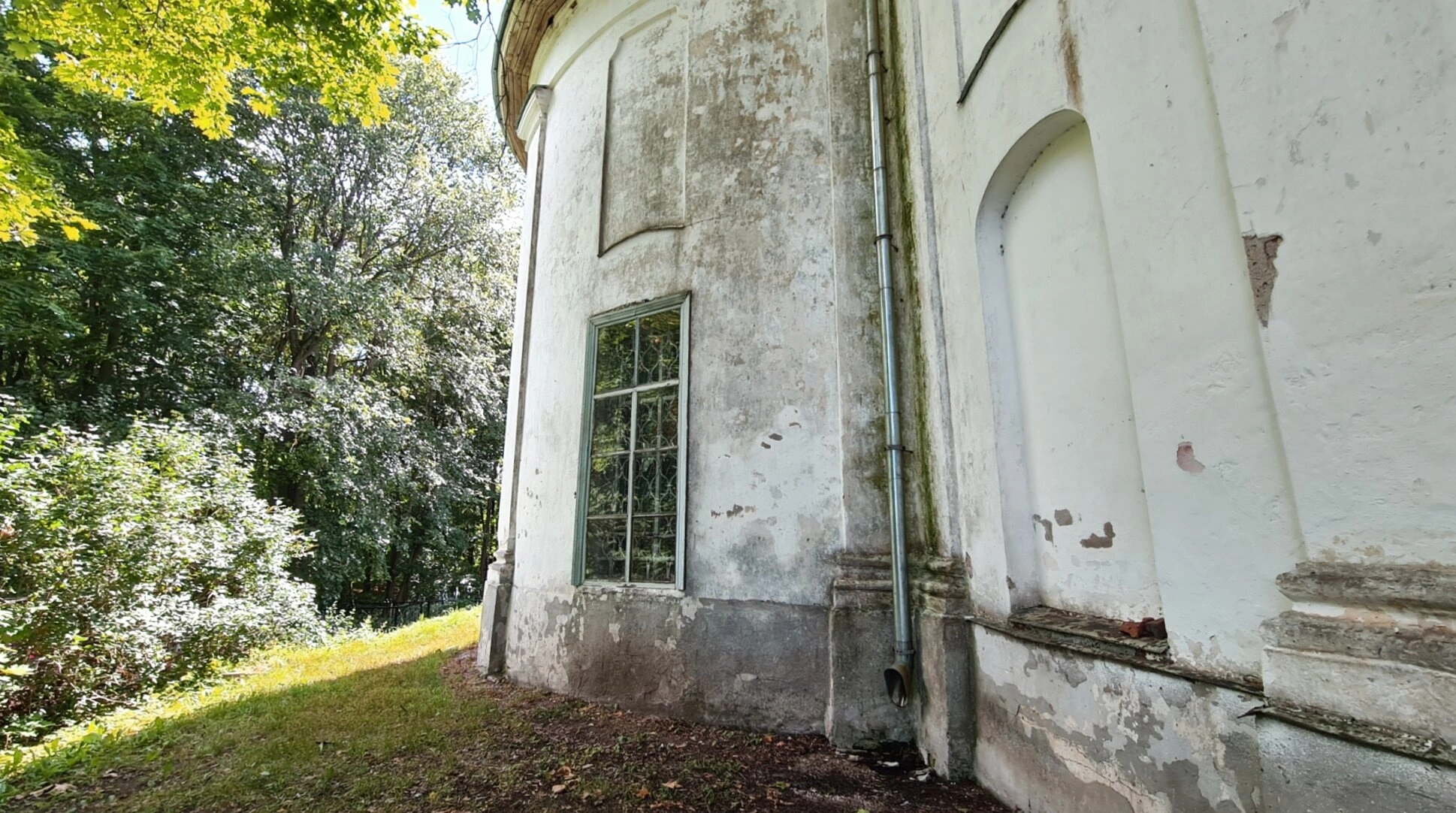 Центральным элементом кадра является высокое арочное окно, предназначенное для освещения алтарного пространства. Оно украшено ажурной кованой решеткой, выполнявшей как защитную, так и декоративную функцию. Рядом угадывается заложенный ныне дверной проем. Водосточная труба, идущая по фасаду, и буйная зелень, окружающая храм, подчеркивают его гармоничную связь с окружающим ландшафтом и атмосферу умиротворенности.