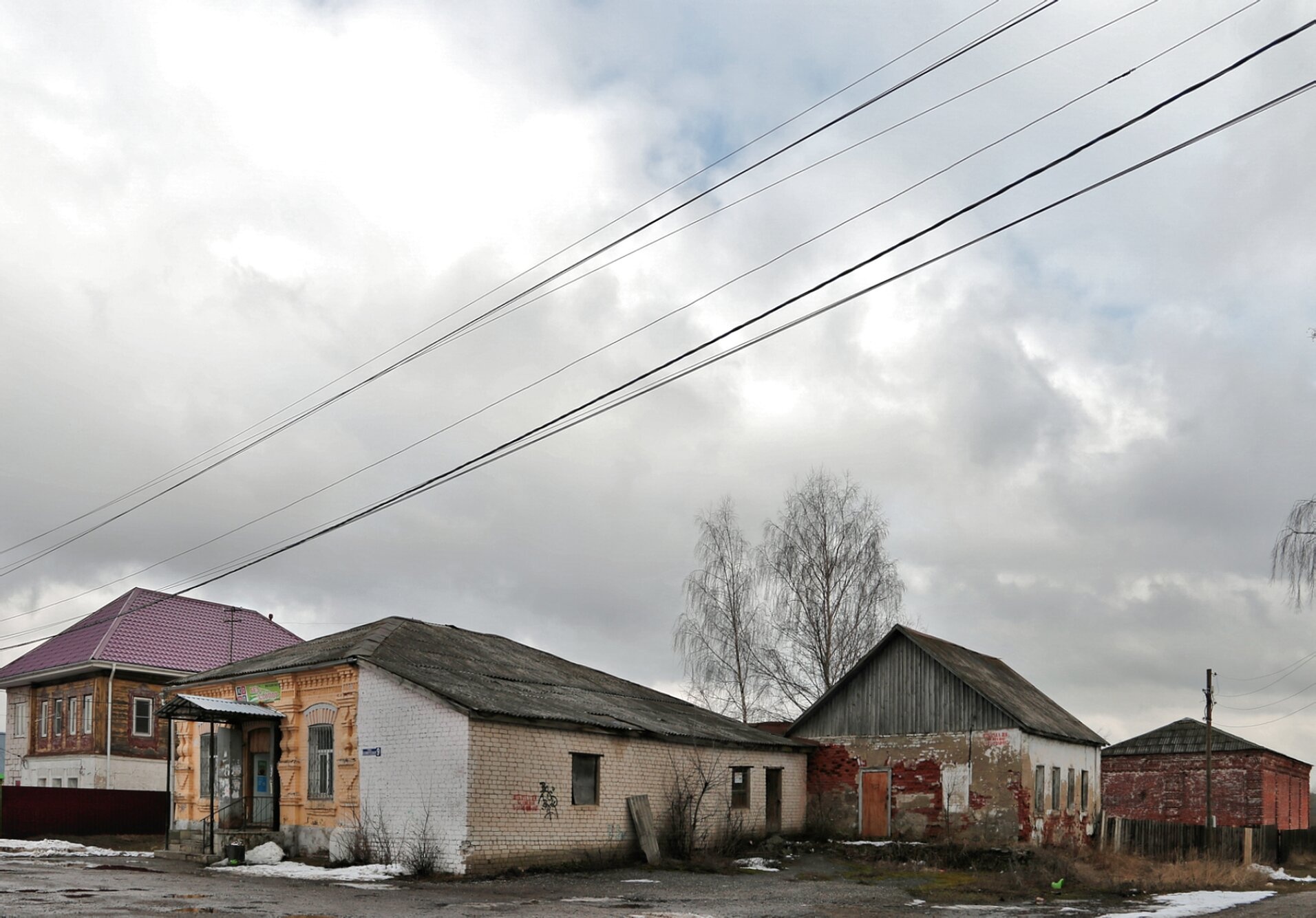Слева на фотографии виден двухэтажный дом с кровлей тёплого оттенка, вероятно, ранее служивший для размещения церковнослужителей или выполнения хозяйственных нужд прихода. В центральной части композиции расположены одноэтажные кирпичные строения, находящиеся ныне в ветхом состоянии. Фасад одного из зданий сохранил фрагменты жёлтой штукатурки, тогда как соседнее строение демонстрирует частично обнажённую кирпичную кладку, что свидетельствует о длительном отсутствии ремонтных работ.