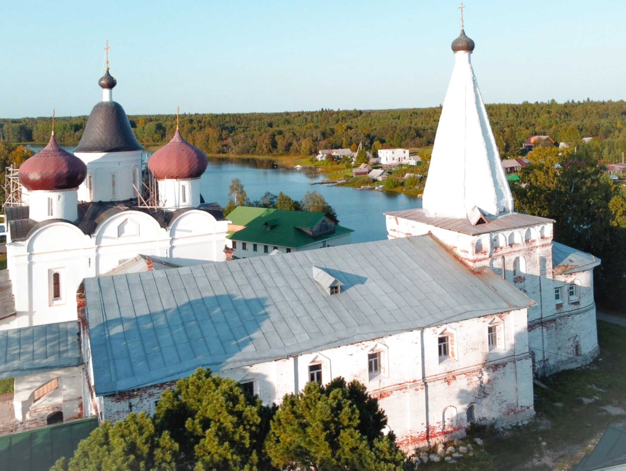 Монастырский комплекс живописно расположен на берегу Северной Двины, что подчеркивает гармоничное единство творения Божиего и человеческого мастерства. На противоположном берегу реки виднеются скромные деревенские строения, составляющие единый ландшафт с духовной обителью.