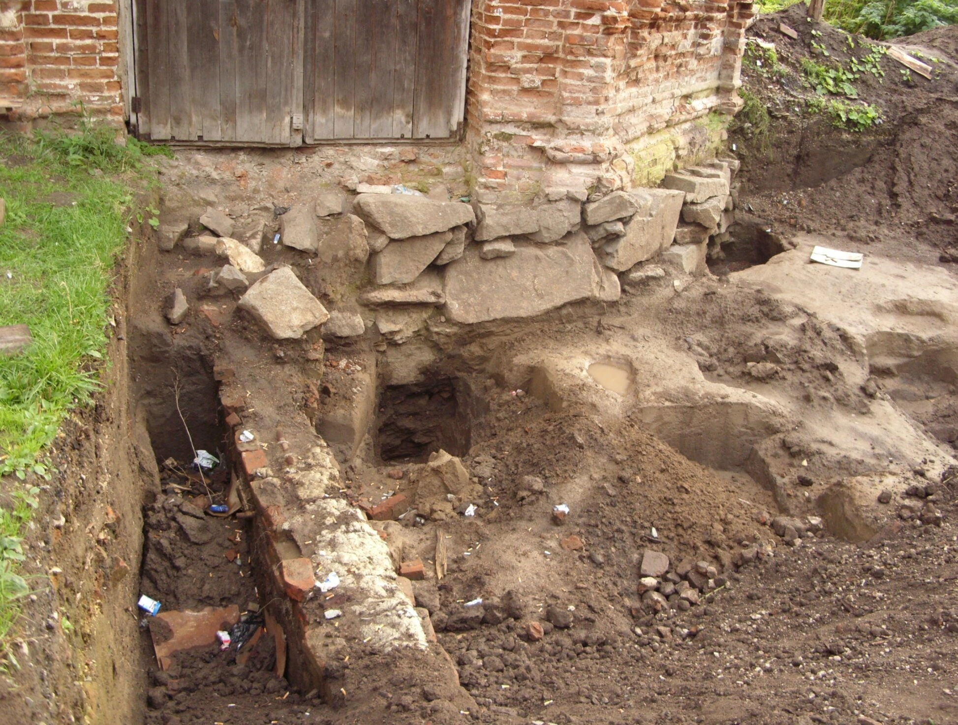 Величественный кирпичный корпус на заднем плане, с массивными деревянными вратами, является неотъемлемой частью архитектурного ансамбля обители. На переднем плане внимательный взгляд различит вскрытые шурфы и траншеи, обнажившие культурные слои почвы, хранящие память о веках. В центре кадра виден фрагмент капитальной кирпичной класки, вероятно, являющийся частью фундамента либо цоколя более древнего строения, что некогда стояло на сем месте.