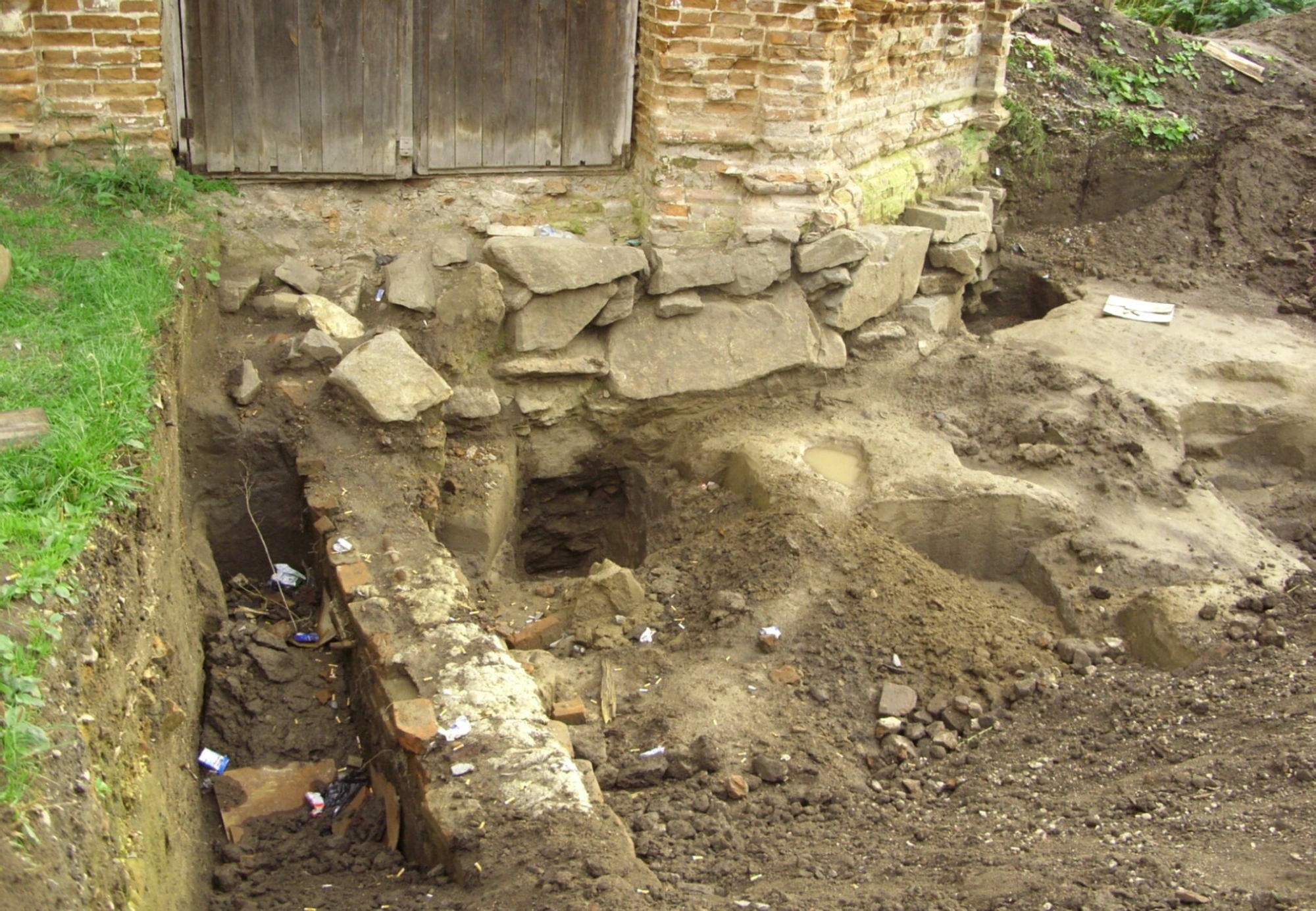 На представленной фотографии запечатлён важный этап археологических изысканий, проводимых на территории Свято-Покровского женского монастыря в городе Верхотурье. Снимок документально фиксирует открытые в ходе научных работ фундаменты исторических монастырских построек, скрытые ранее в земле. Чётко видны фрагменты кирпичной кладки, камни основания, а также траншеи, позволяющие исследовать стратиграфию культурного слоя.