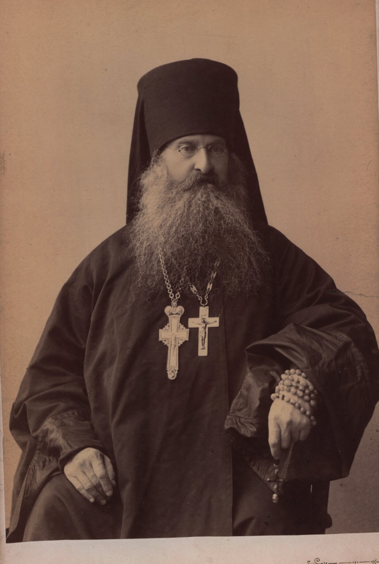 На представленной фотографии запечатлён высокопреосвященный Иоанн (в миру Иван Ксенофонтович Смирнов), архиепископ, стоявший у руководства Тюменского Свято-Троицкого мужского монастыря в начале XX столетия. Владыка изображён в традиционном для православного архиерея облачении, воплощающем духовное достоинство и священный сан. На его голове возвышается белый клобук — символ монашеского чина и умерщвления мирской суеты, увенчанный крестом. Лик архипастыря обрамляет длинная, ухоженная борода, придающая его облику величие и благолепие, свойственное русскому духовенству того времени.