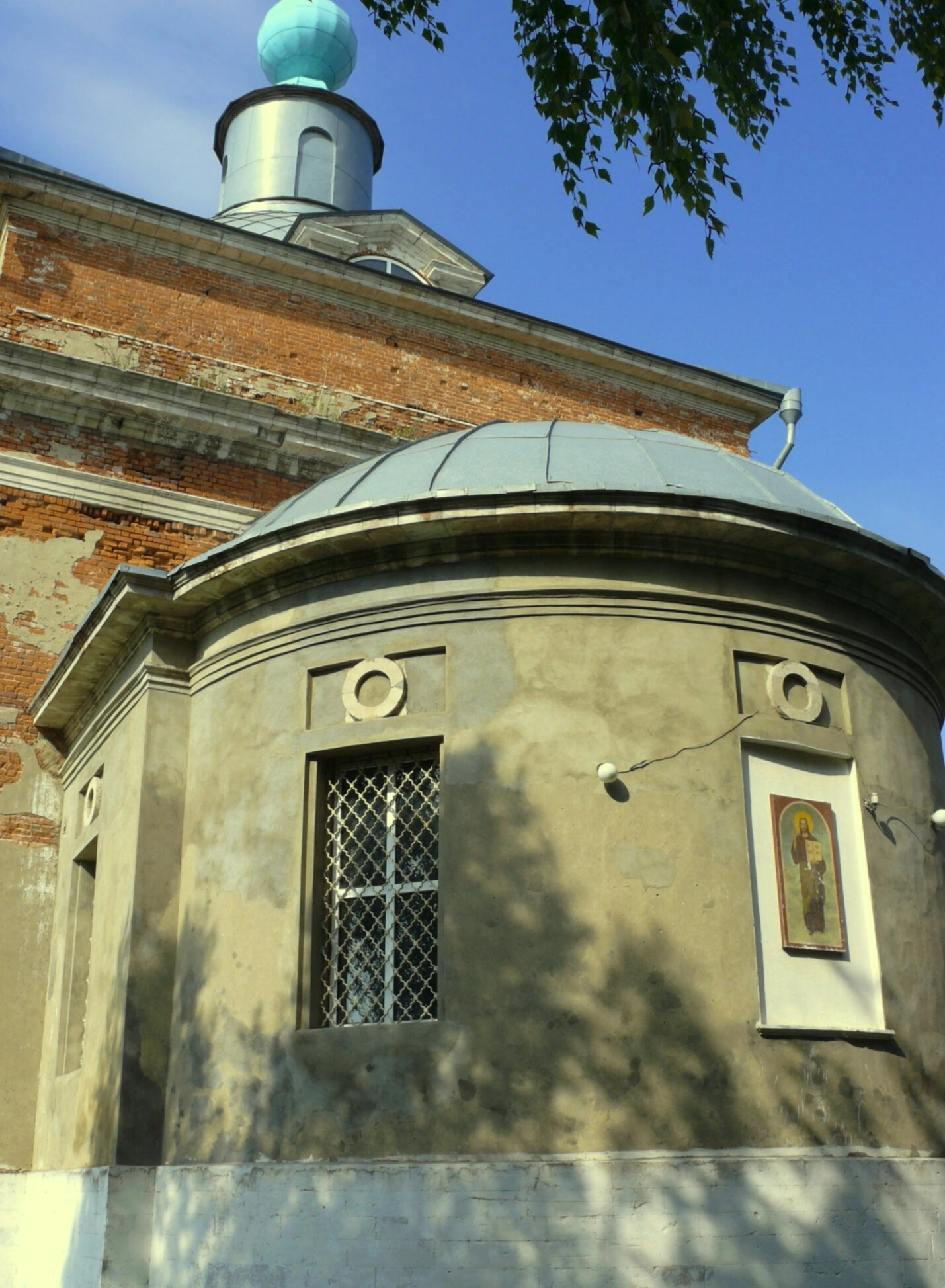 Ниже расположен один из боковых приделов собора, на стене которого находится закреплённая в киотной нище почитаемая икона. Справа от неё расположено высокое прямоугольное окно, обрамлённое металлической решёткой, а выше — два круглых декоративных окна-голосника, характерных для традиционного церковного зодчества. Игра солнечного света и теней от листвы окружающих деревьев добавляет изображению глубины и одухотворённости, подчёркивая божественную благодать, пребывающую в этом месте.