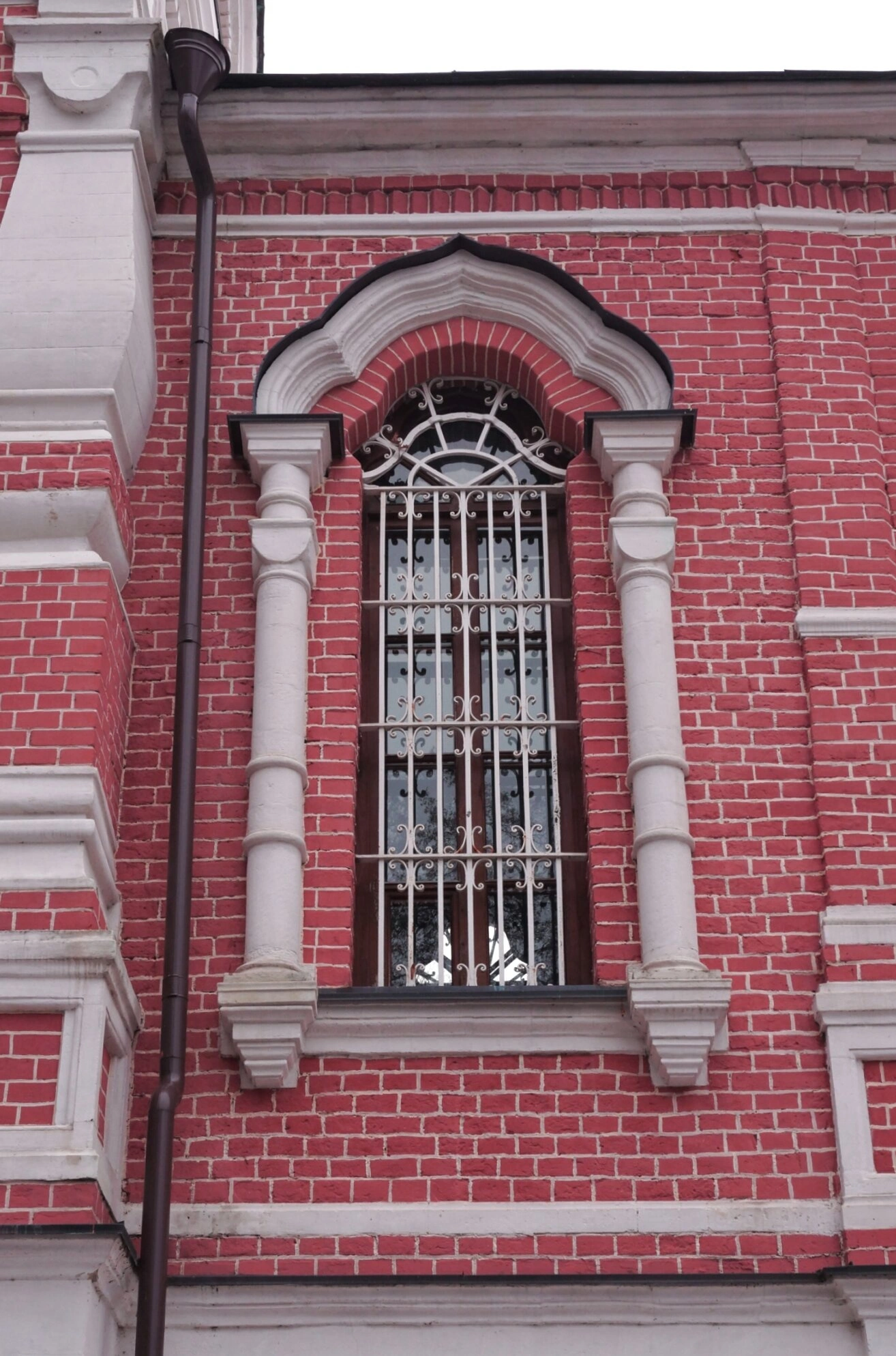 Оконный проем защищен искусно выполненной кованой металлической решеткой, которая одновременно обеспечивает безопасность и служит элементом декора. С левой стороны окна по кирпичной стене проходит коричневый водосточный желоб, необходимый для сохранения конструкции храма от воздействия атмосферных осадков.