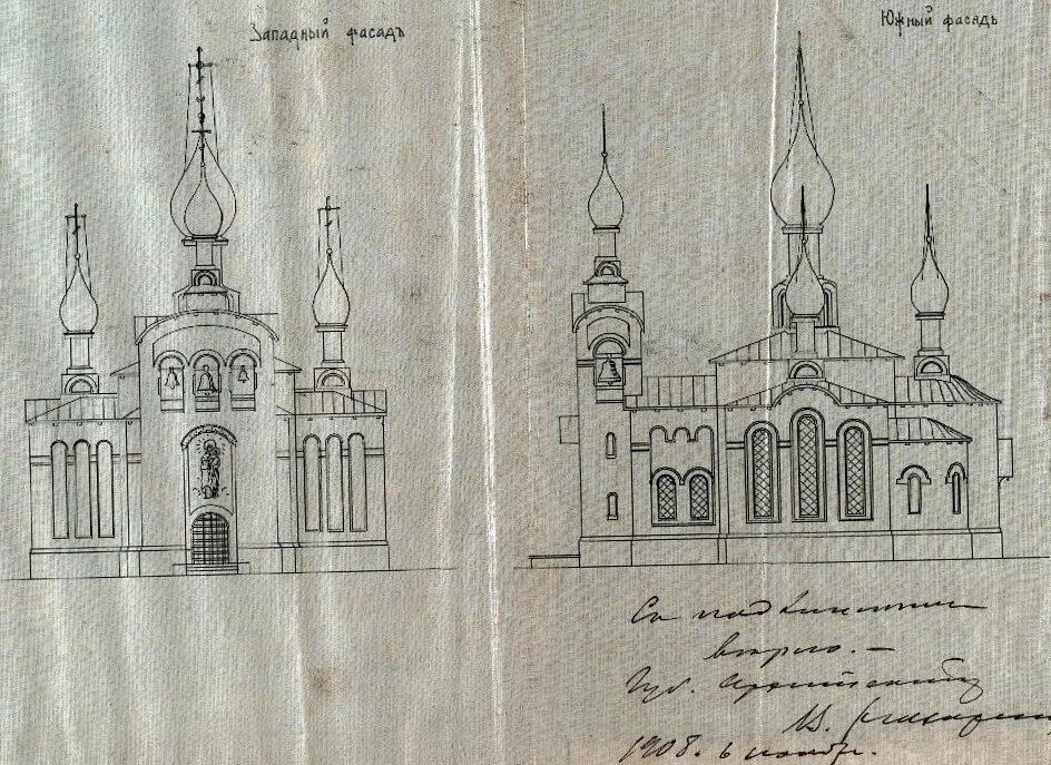 Проект детально демонстрирует два основных фасада будущего храма. Западный фасад, являющийся главным, reveals парадный вход, над которым возвышается многоярусная колокольня, увенчанная куполом. Композиция завершается центральным световым барабаном с главкой. Южный фасад позволяет оценить боковой объём здания, пропорции оконных проёмов и архитектурный декор, характерный для православного церковного строительства того периода.