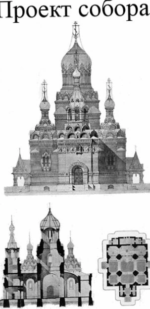 В верхней части листа изображён изящный фасад будущего собора. Храм решён в русско-византийском стиле, с характерным пятиглавием, где центральный купол, символизирующий Христа, возвышается над четырьмя боковыми, олицетворяющими евангелистов. Фасад украшен килевидными закомарами, арочными оконными проёмами и декоративными кокошниками, что создаёт богатую игру света и тени.