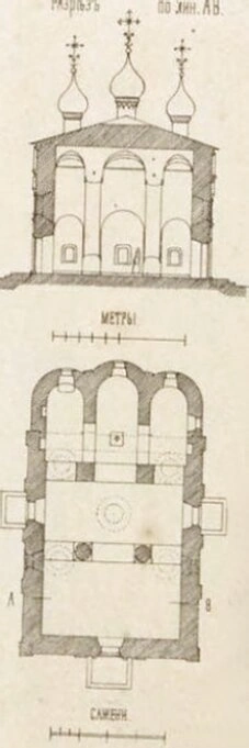 Архитектурный план позволяет discernть классическую для того периода структуру: четверик основного объёма, алтарную апсиду и трапезную часть. Разрез по линии А-B наглядно иллюстрирует высотные отметки, конструкцию сводов и предполагаемое расположение иконостаса. По сохранившимся сведениям, церковь была украшена богатым кирпичным декором, характерным для русского узорочья.