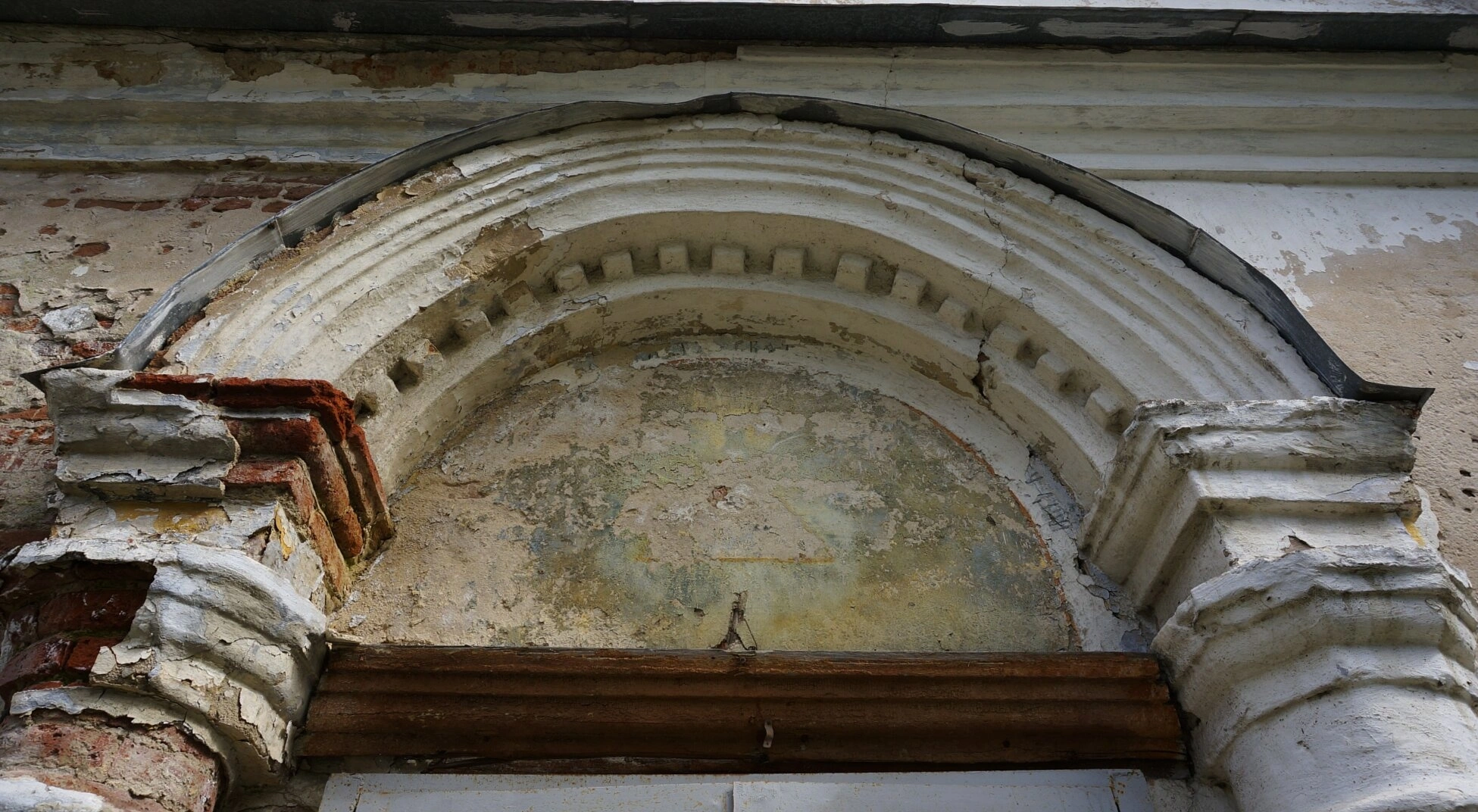 Поверхность арки сохранила следы многослойной отделки: облупившаяся белая краска reveals более ранние слои штукатурки и кирпичную кладку, что позволяет изучать историю ремонтов и реставраций храма. Внутри арки расположен люнет — полукруглое поле, где просматриваются остатки первоначальной фресковой росписи. К сожалению, изображение сильно выцвело и практически утрачено, однако даже фрагменты позволяют судить о богатом художественном убранстве храма в прошлом.