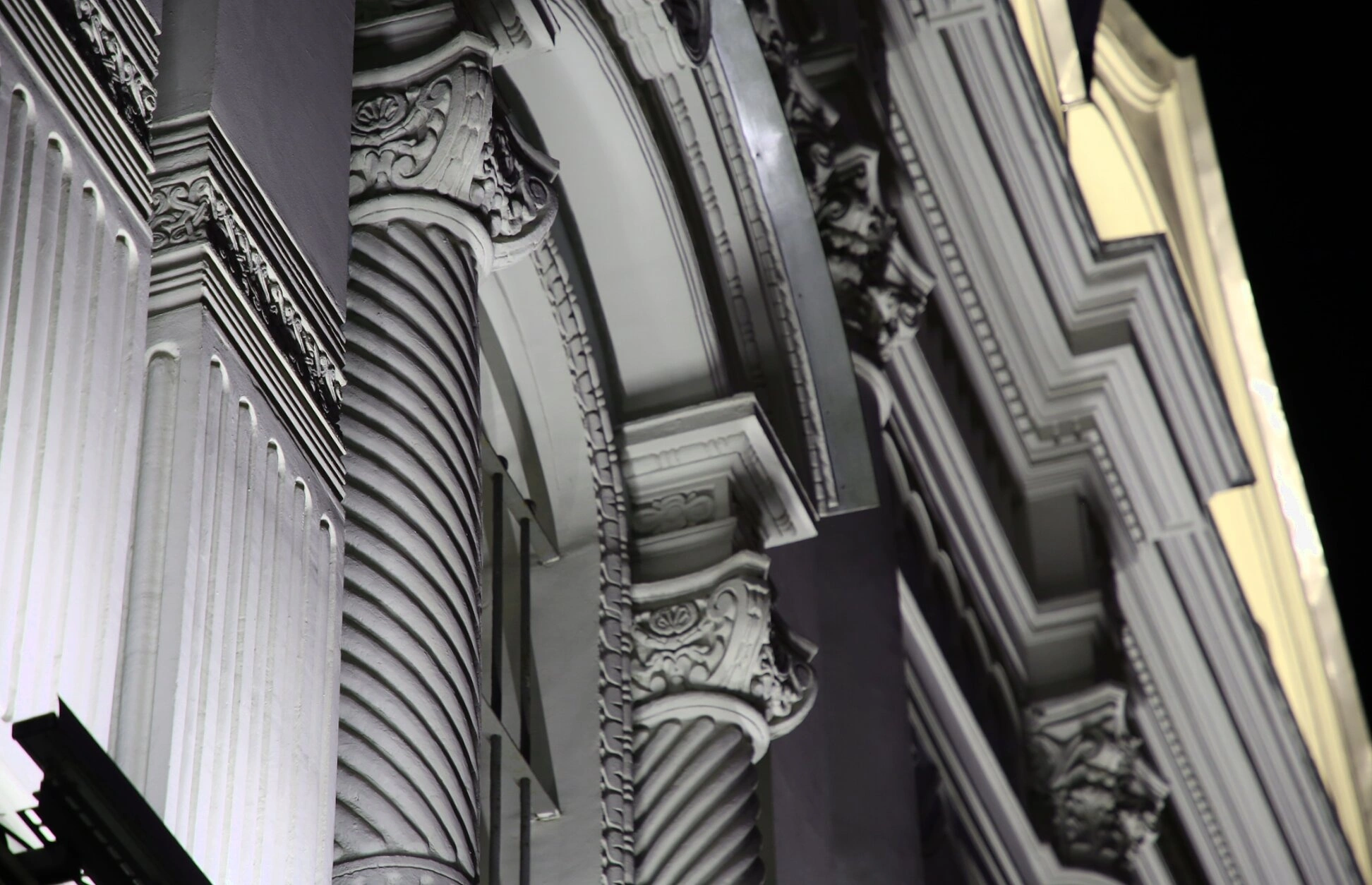 В левой части композиции видны колонны с вертикальными каннелюрами (желобками), а в центре и справа — колонны со спиральными, винтовыми каннелюрами. Богато украшенные капители колонн выполнены в стиле барокко или классицизма и покрыты резными орнаментами. Фасад дополняют сложные карнизы, молдинги и фризы с лепниной и резьбой, характерные для храмовой архитектуры XIX века.