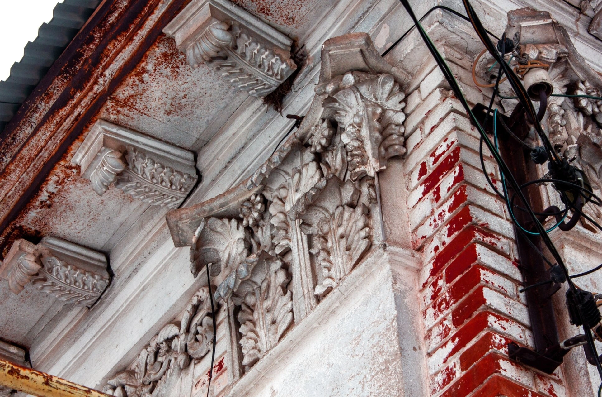 При детальном рассмотрении отмечается неудовлетворительное состояние сохранности фасадных элементов. Лепной декор частично утрачен, наблюдаются многочисленные трещины и сколы штукатурного слоя. Металлические элементы кровельной системы подвержены коррозионным процессам. В правой части композиции просматривается кирпичная кладка, тогда как основная поверхность стены оштукатурена и имеет светлое окрашивание.