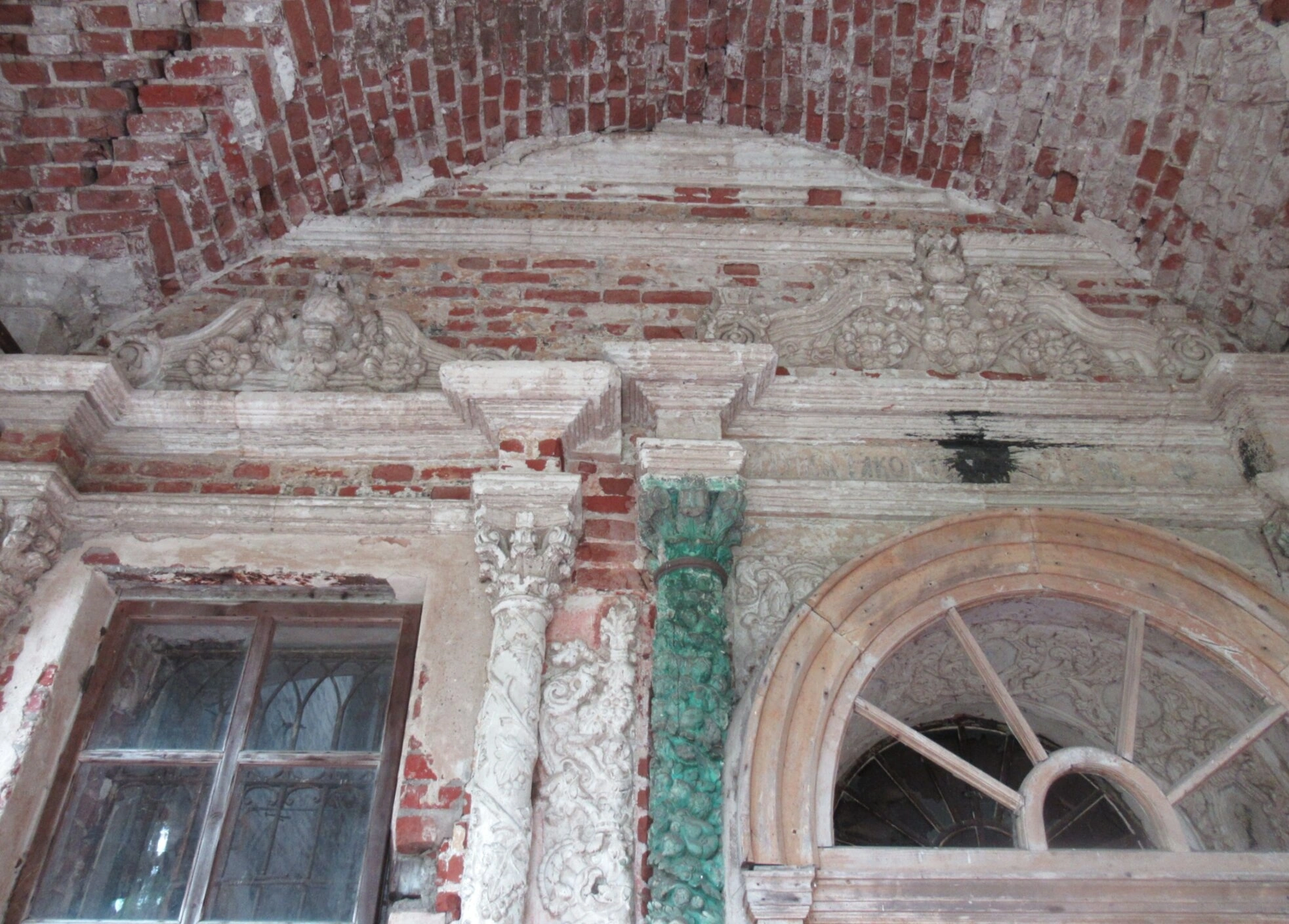 В левой части композиции чётко просматривается прямоугольный оконный проём с сохранившейся деревянной рамой и классическим переплётом. Справа взору открывается арочное окно, завершающееся изящной полукруглой дугой с радиальной расстекловкой, что характерно для храмовой архитектуры периода барокко. Стена обильно украшена декоративной лепниной белого цвета: пилястры с капителями и резные орнаментальные пояса над проёмами, несмотря на повреждения, сохраняют следы былого художественного замысла.