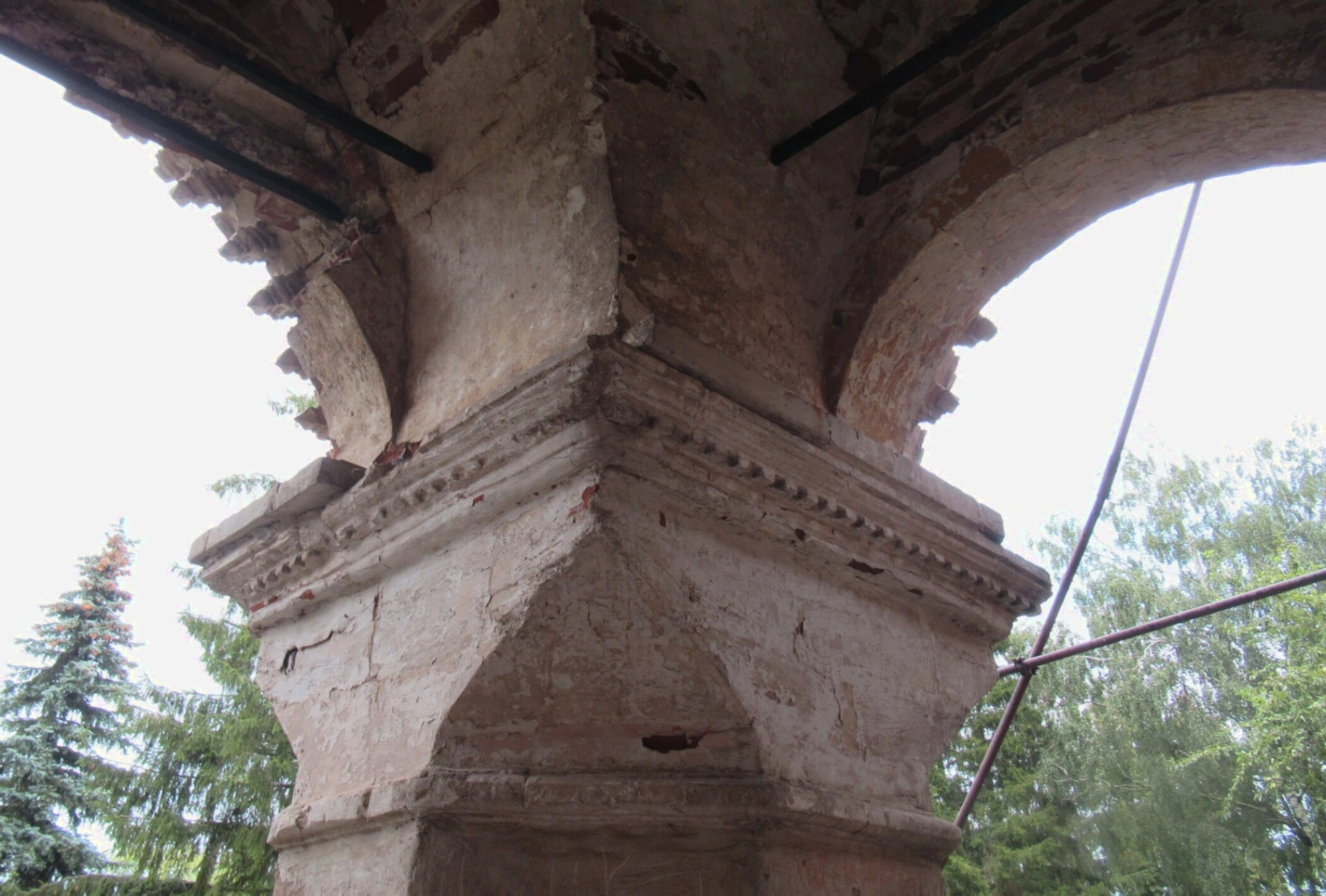 В верхней части сооружения просматриваются основания арок, образующих церковные своды, которые в православной архитектуре символизируют небесный купол и Божественное покровительство. Декоративные элементы в виде архитектурных поясов и карнизов подчёркивают сакральное значение опоры как несущей основы храмового пространства, что соответствует канонам церковного зодчества.