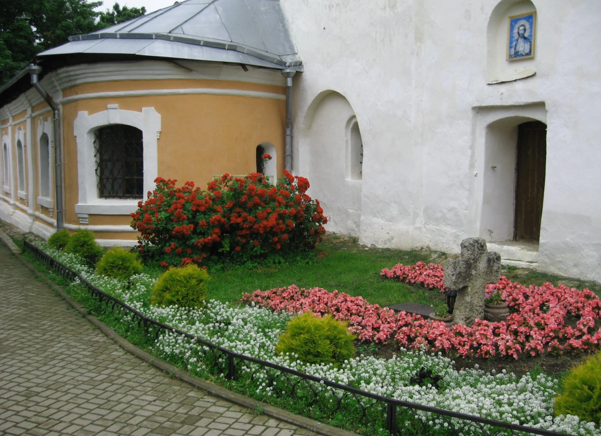 Центральным духовным акцентом сада является старинный каменный крест, установленный в середине цветочной клумбы. Подобные кресты на Руси традиционно воздвигались в знак благодарности Господу или в память о значимом событии. Его присутствие напоминает о многовековой молитвенной истории этого места. Слева видна вымощенная брусчаткой дорожка, отделённая от зелёного газона невысоким кованым ограждением, что символизирует гармонию между рукотворным порядком и природной красотой, столь характерную для православного монастырского быта.
