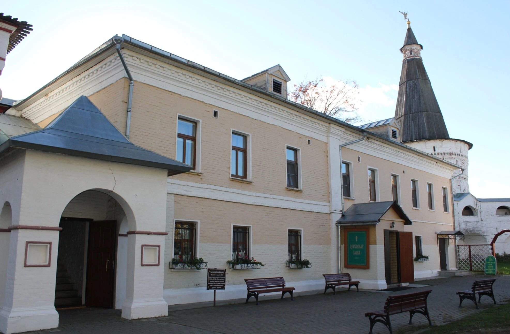 На представленной фотографии запечатлён вид на архитектурный ансамбль ставропигиального мужского Иосифо-Волоцкого монастыря, расположенного в селе Теряево Волоколамского городского округа Московской области. На переднем плане изображён казначейский корпус, возведённый в конце XIX века. Здание выполнено в светлых тонах с выразительными белыми декоративными элементами, характерными для русской монастырской архитектуры того периода. Фасад украшают аккуратные оконные проёмы и несколько входных групп, над которыми расположены защитные козырьки. Перед корпусом установлены скамьи, предназначенные для отдыха паломников и прихожан.