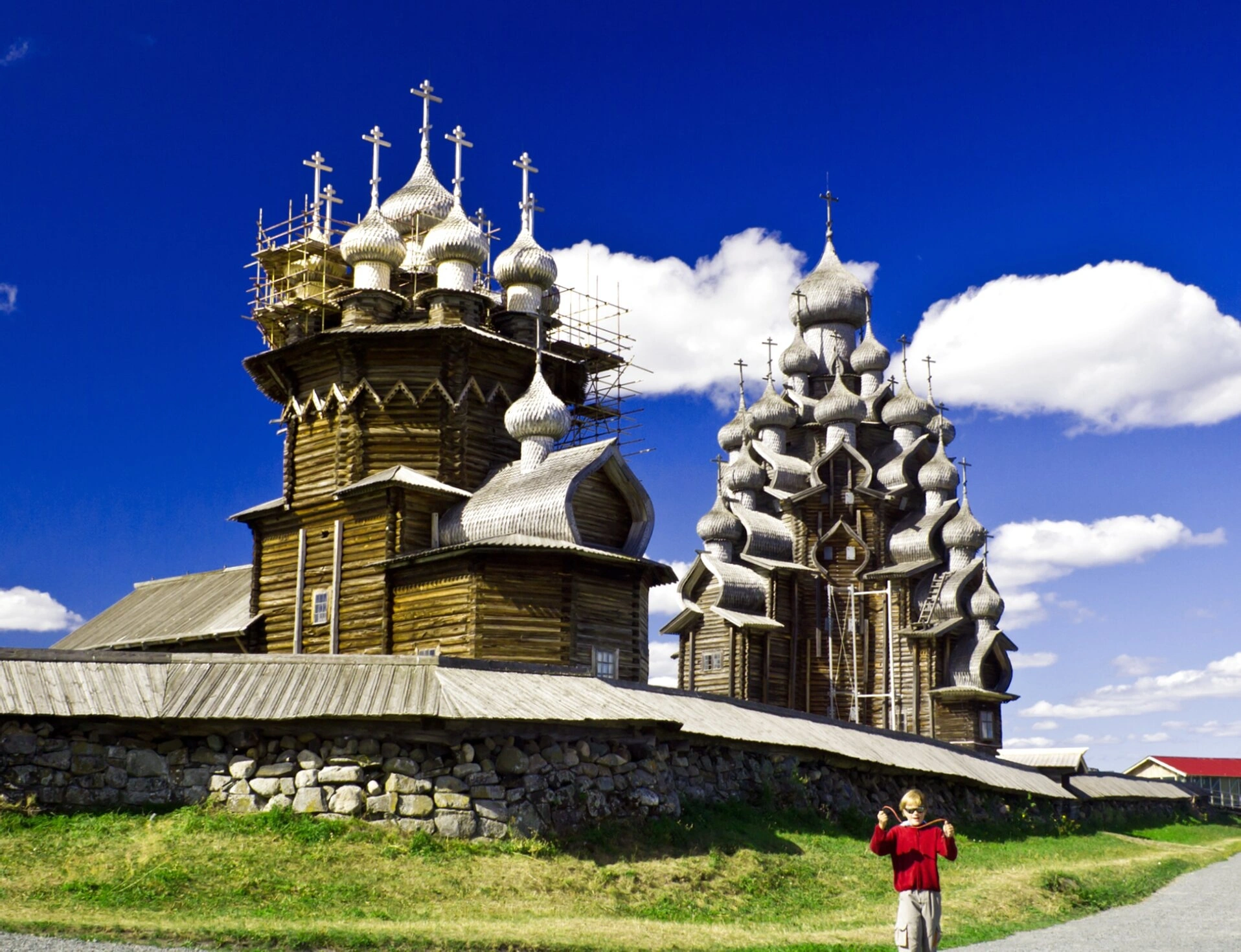 На переднем плане, в нижней правой части кадра, изображён человек в красной рубашке, идущий по дорожке. Его присутствие подчёркивает масштаб сооружений и позволяет оценить их величие. Задний план заполняет яркое голубое небо с кучевыми облаками, характерное для летнего дня в Карелии.