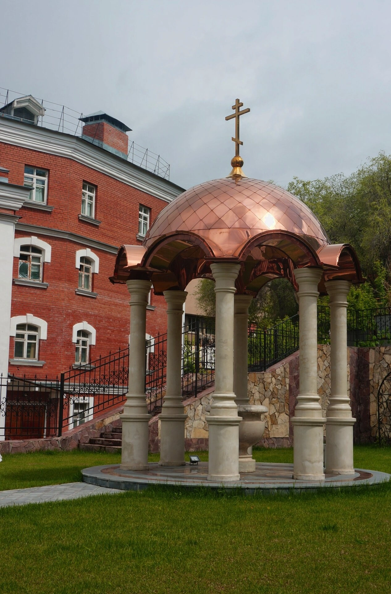 На представленной фотографии запечатлён архитектурный ансамбль Иверского женского монастыря, находящегося в городе Самаре. В центре композиции располагается малая церковная форма — изящная часовня, увенчанная золочёным куполом чешуйчатой фактуры и православным восьмиконечным крестом. Купол покоится на светом каменном барабане, который поддерживается массивными колоннами, образующими арочные проёмы.