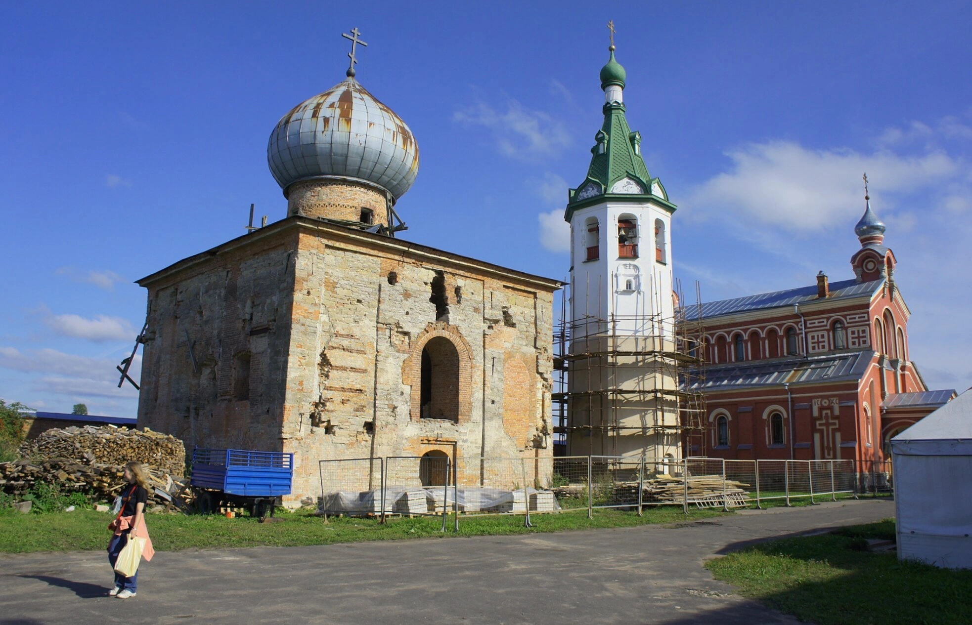 На переднем плане видна грунтовая дорога, а также элементы благоустройства территории, что свидетельствует о непрестанных трудах братии и благотворителей по возрождению святой обители. Присутствие человека на фотографии добавляет кадру масштаб и живость, напоминая о том, что монастырь является живым организмом, где совершается молитва и труд. Ясный солнечный день, запечатлённый на снимке, наполняет архитектурный пейзаж благодатным светом, подчёркивая красоту православных святынь и величие трудов по их восстановлению.